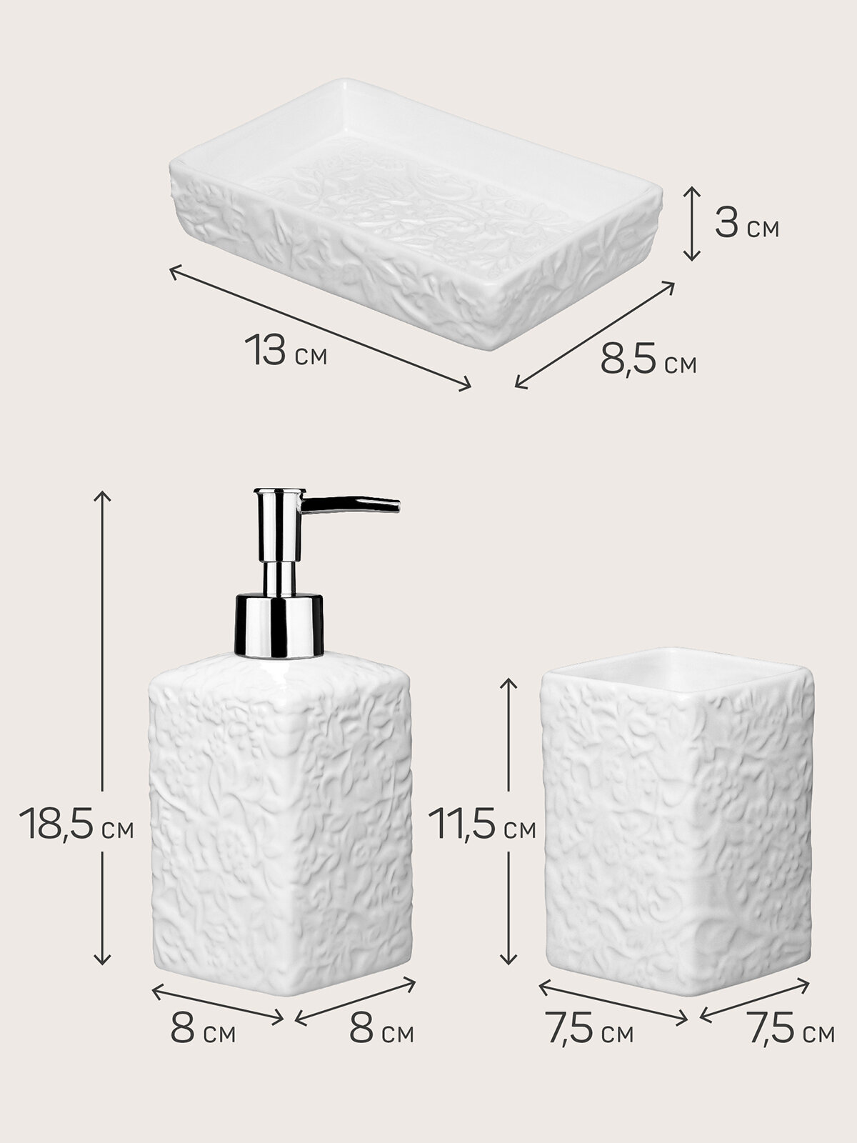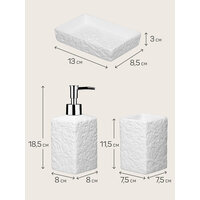 | Подробная комплектация | Стакан для зубных щеток - 1 шт.; мыльница - 1 шт.; дозатор для жидкого мыла - 1 шт. |
