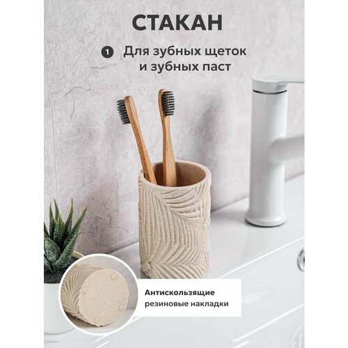 Набор аксессуаров для ванной комнаты Bauheim из полирезина – практичный комплект для ванной, который помогает держать мыло, щётки и дозатор в порядке возле раковины. Светлый фактурный дизайн с мягким рельефом украшает столешницу и подходит для современных интерьеров ванной комнаты.