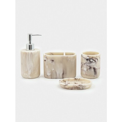 Ваша ванная заслуживает не просто порядка, а настоящей эстетической паузы. Этот набор аксессуаров с мраморным узором добавляет в утренние ритуалы ноту спокойной роскоши, превращая разрозненные мелочи в цельный элемент интерьера. Четыре предмета в тёплом бежевом оттенке создают мгновенное ощущение гармонии и завершённости. Единство деталейВ комплекте дозатор для жидкого мыла, два стакана для хранения щёток и мыльница. Материал полирезин устойчив к влаге, сохраняет чистый внешний вид и не скользит в руках. Дизайн «Мгновение» выполнен в мраморной тематике — узор отличается уникальностью и естественностью. Нейтральный бежевый цвет служит идеальным фоном для декоративных элементов в стиле бохо или классика. Полный набор избавляет от поиска аксессуаров по отдельности, сразу создавая целостный образ. Осознанный декорПоверхность с имитацией мрамора привносит в пространство текстурную глубину, которую хочется рассматривать. Этот комплект для ванной комнаты — это больше, чем просто функциональные предметы; он становится частью атмосферы вашего дома. Каждое касание дозатора или взгляд на стоящие в стакане щётки напоминают о выбранном стиле. Порядок здесь — это не строгость, а ощущение заботы о пространстве вокруг себя.