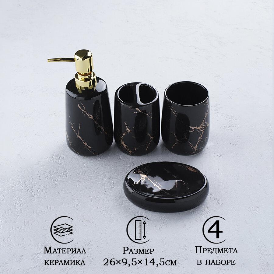 Купить Набор для ванной «Молния», 4 предмета (мыльница, дозатор для мыла 390 мл, 2 стакана), цвет чёрный с доставкой по всей России.