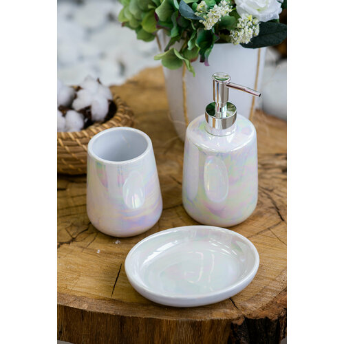 Набор аксессуаров для ванной «Pearl» состоит из 3-х предметов – мыльницы, диспенсера для жидкого мыла и стакана для зубных щеток. Аксессуары отличаются лаконичным дизайном.¶Набор предметов для ванной поможет создать атмосферу уюта и организовать пространство вашего дома. Аксессуары изготовлены из прочной керамики, устойчивы к перепадам температуры и высокой влажности. ¶Набор для ванной может стать чудесным подарком на новоселье, Новый год, День Рождения и 8 марта.