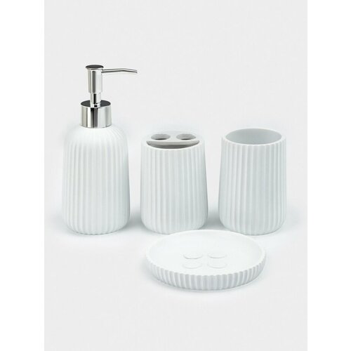 Пространство ванной комнаты часто требует не блеска, а спокойствия. Этот белый комплект аксессуаров с матовой поверхностью создает именно такую атмосферу — без бликов и суеты. Четыре предмета в едином стиле «Сияние» добавляют интерьеру тактильной глубины и визуального тепла, превращая зону у раковины в уголок для размеренного начала и завершения дня.