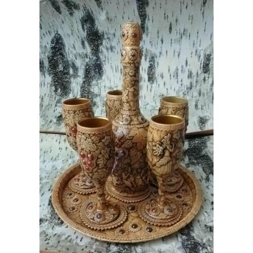 Набор включает в себя штоф, выполненный из стекла, и пять бокалов, каждый из которых инкрустирован многослойной берестой и натуральными камнями - сердоликом, аметистом и тигровым глазом. Подставка под штоф и бокалы на подносе выполнена из агатовых срезов в прорезной бересте, что придает изделию особый шарм.