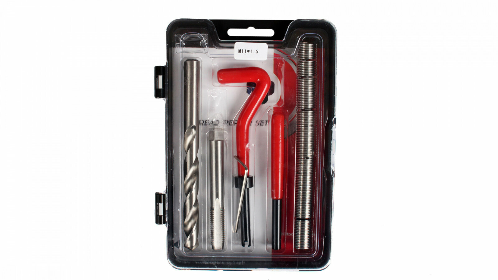 Набор приспособлений и ремвставок для восстановления резьбы М11х1,5 мм. Применение: При проведении слесарных и ремонтных работ. Ремонт повреждённых или старых резьбовых соединений. В комплект входят: - Сверло - 1 шт. - Метчик специальный - 1 шт. - Инструмент для установки вставок - 1 шт. - Инструмент для отламывания установочных хвостовиков резьбовых вставок - 1 шт. - Ключ шестигранный - 1 шт. - Вставки резьбовые - 13 шт.