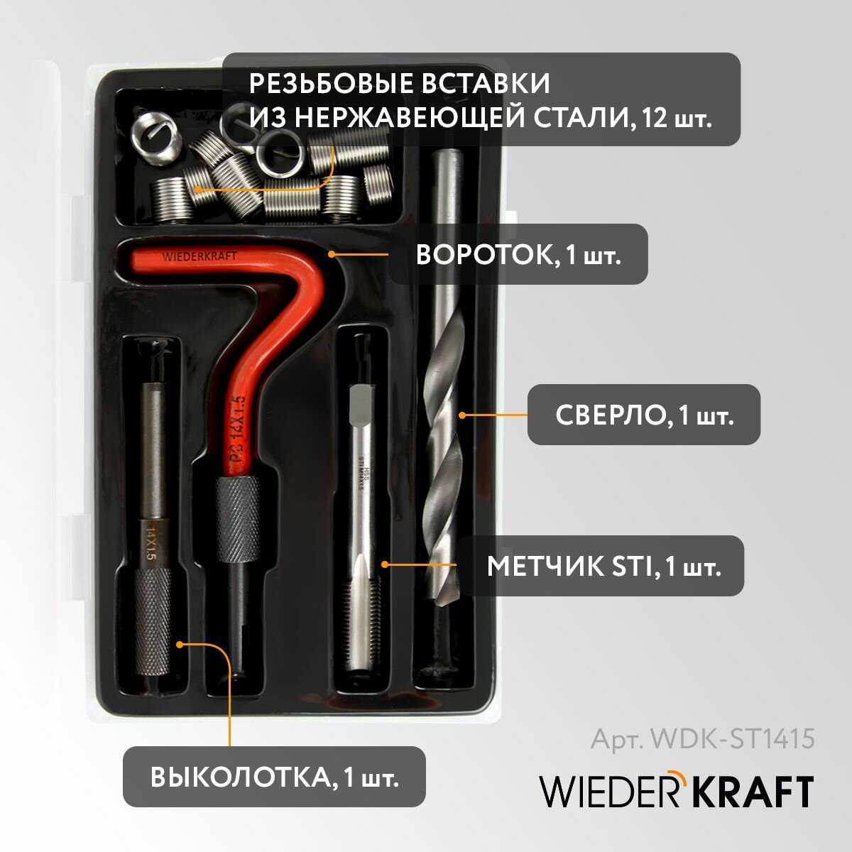 Купить Набор для восстановления резьбы M14X1,5, 16 предметов WIEDERKRAFT WDK-ST1415 с доставкой по всей России.