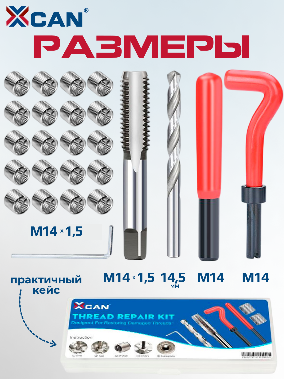 Набор для восстановления резьбы XCAN М14х1,5 мм, 25 предметов, станет незаменимым помощником в повседневном ремонте, ремонте автомобилей, сверлильных станках и других областях, где требуется восстановление резьбы.
