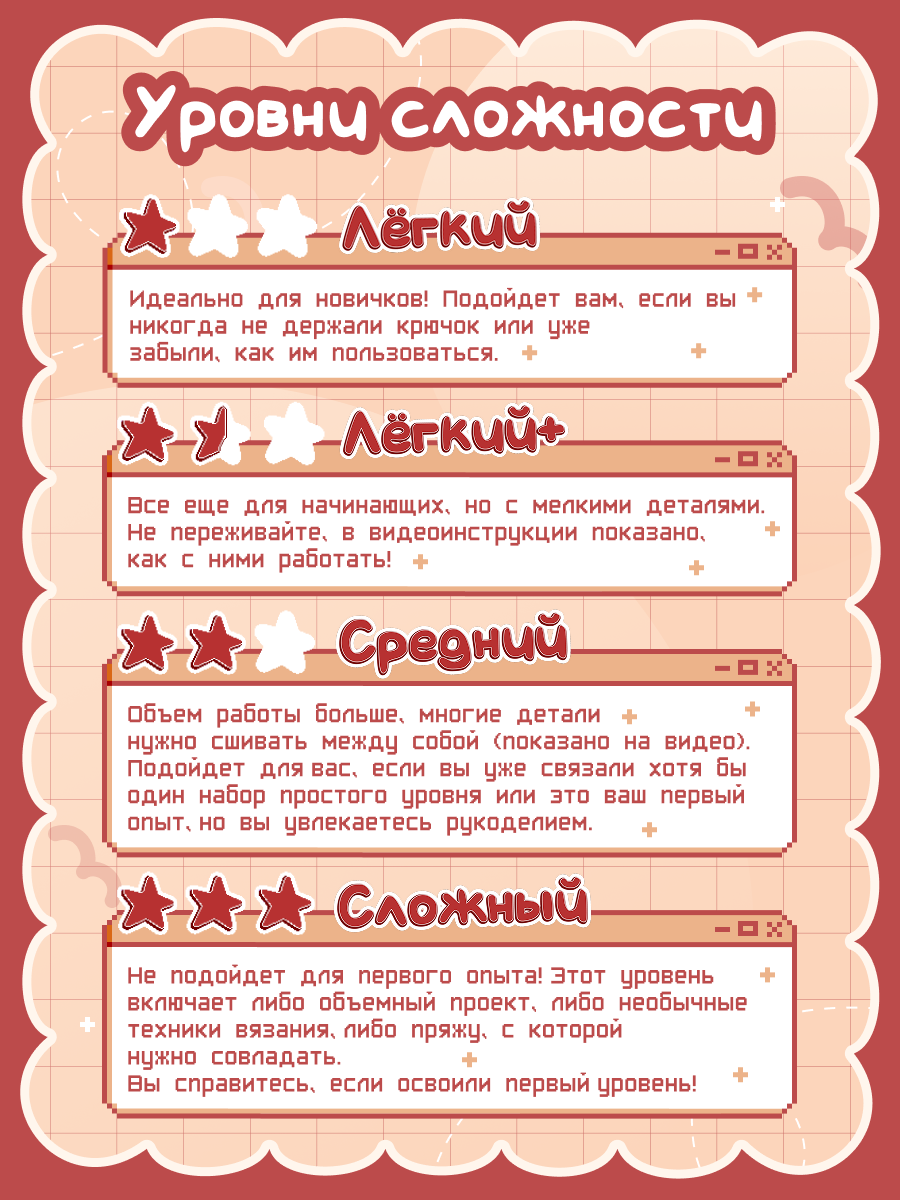 Набор уровня сложности 1/3 - подходит для начинающих. Видео про все элементы вязания, использующиеся в наборе, есть на наших страницах в соц. сетях. Ссылки на видео вы найдёте внутри схемы. Дополнительно к схеме есть полное видео вязания. Если у вас возникнут любые сложности или вопросы по набору и схеме - не стесняйтесь обратиться к нам за помощью, наша команда всегда на связи и готова помочь всем обратившимся!