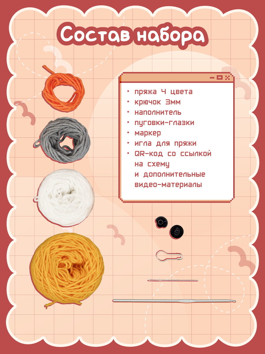 Пряжа, крючок, игла для пряжи, маркер, QR-код со схемой, синтепон, фурнитура
