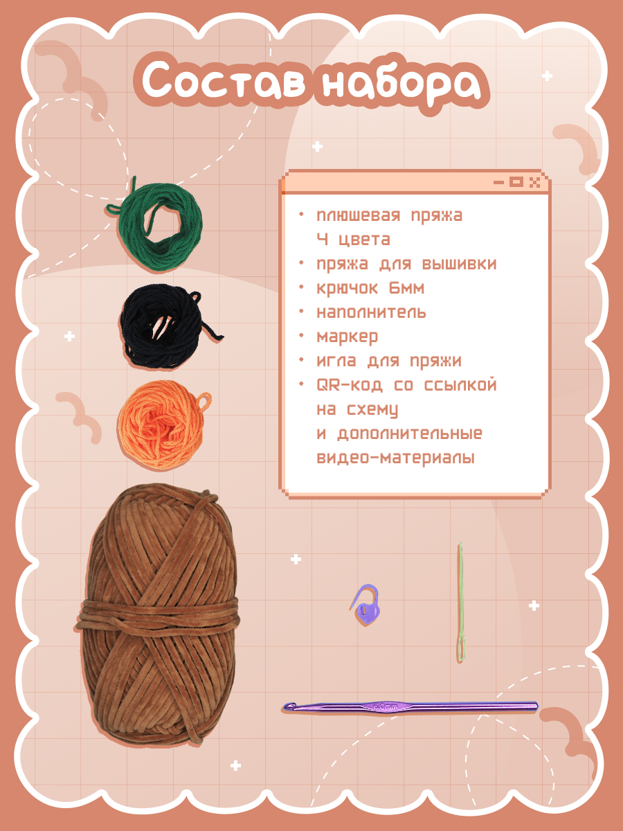 Набор уровня сложности 1/3 - подходит для начинающих. Видео про все элементы вязания, использующиеся в наборе, есть на наших страницах в социальных сетях (ссылки есть в схеме). Дополнительно к схеме есть несколько вспомогательных видео - например, видео о том, как привязывать лапки. Если у вас возникнут любые сложности или вопросы по набору и схеме - не стесняйтесь обратиться к нам за помощью, наша команда всегда на связи и готова помочь всем обратившимся!