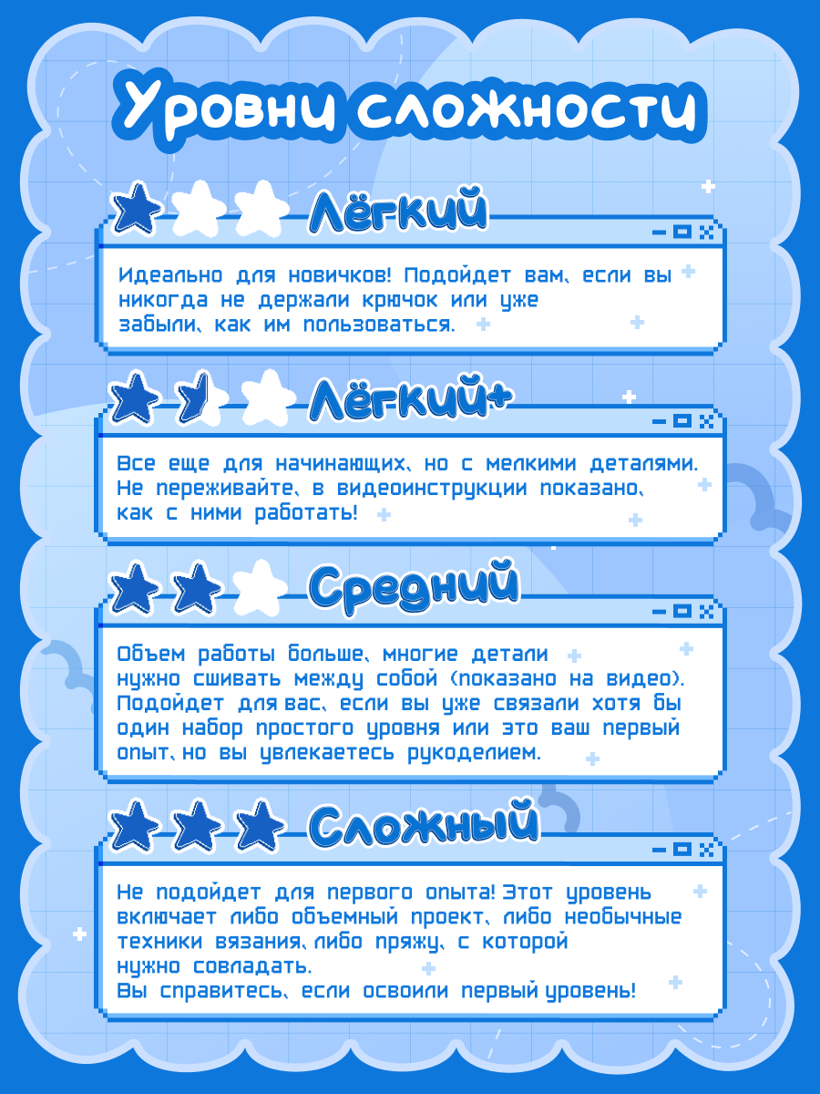 Набор уровня сложности 3/3 - подходит для тех, кто освоил сбн и готов к работе над мелкими деталями. Как с ними работать рассказано в видео. Видео про все элементы вязания, использующиеся в наборе, есть на наших страницах в социальных сетях (ссылки есть в схеме). Если у вас возникнут любые сложности или вопросы по набору и схеме - не стесняйтесь обратиться к нам за помощью, наша команда всегда на связи и готова помочь всем обратившимся! Набор отправляется в подарочной упаковке - отличное решение для подарка себе, близким, любителям вязания или подарков, сделанных своими руками.