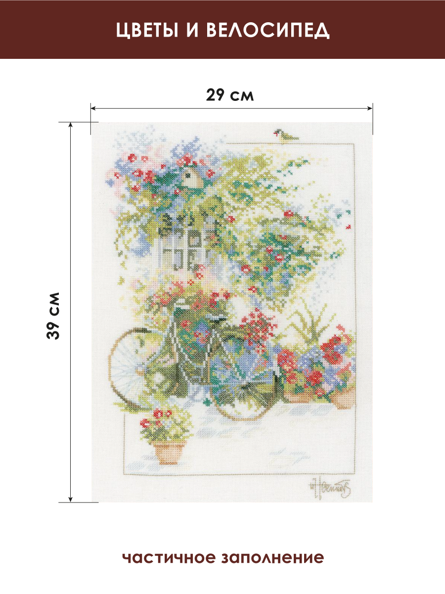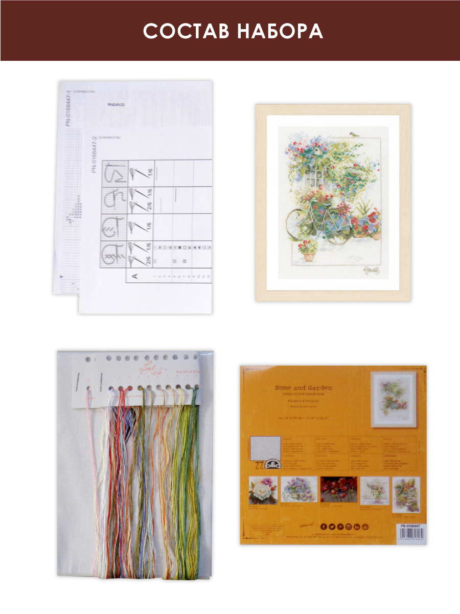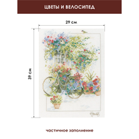 Набор для вышивания "LANARTE" №082 PN-0168447 "Цветы и велосипед" 39x29 см. Набор для вышивания включает все, что необходимо для создания шедевра своими руками: канва белого цвета, хлопковые мулине DMC на бумажном органайзере, игла, черно-белая символьная схема, инструкция на русском языке. Все материалы высокого качества, с которыми удобно работать, а результатом работы с которыми - можно только наслаждаться. Заполнение: Частичное