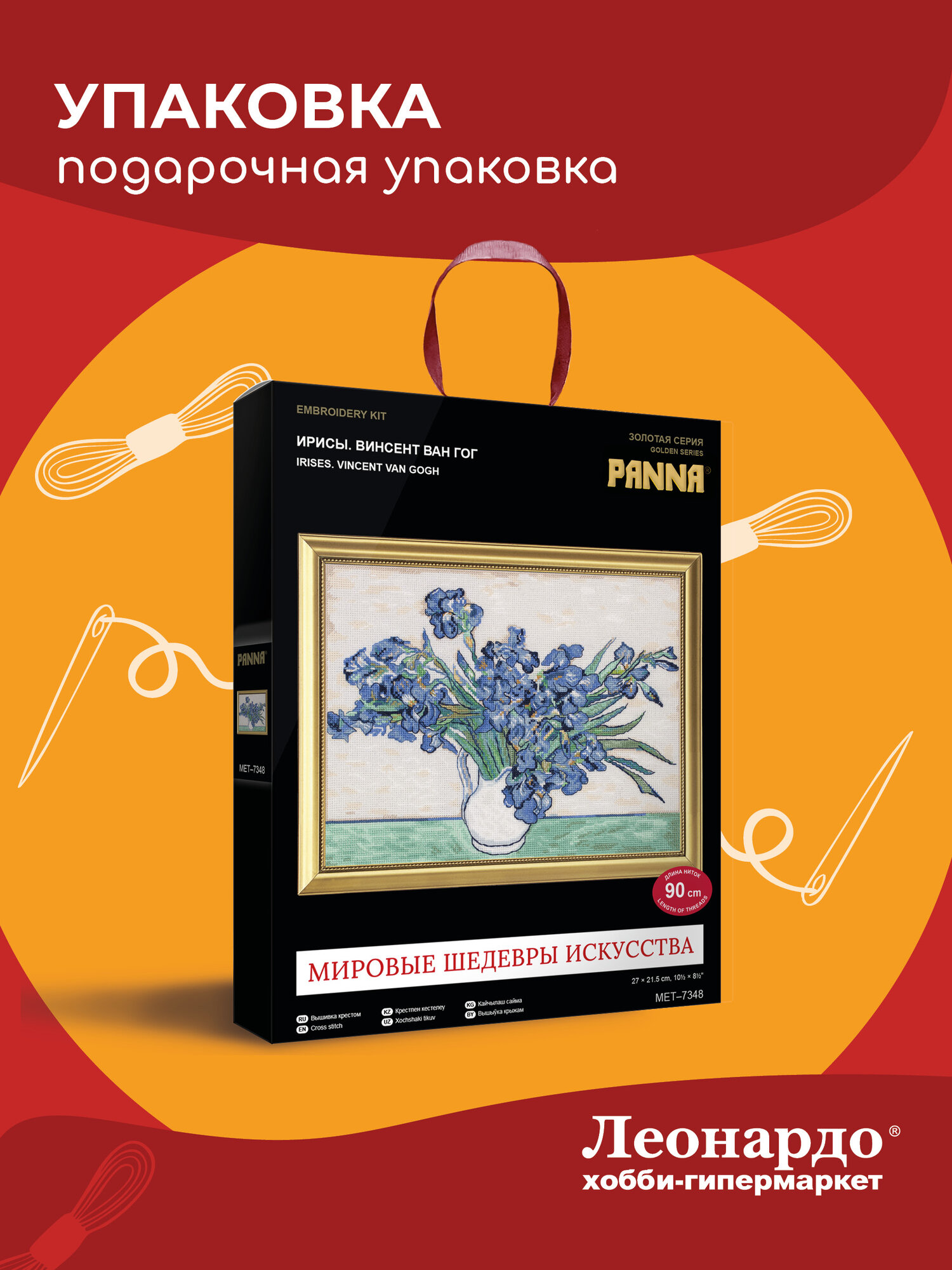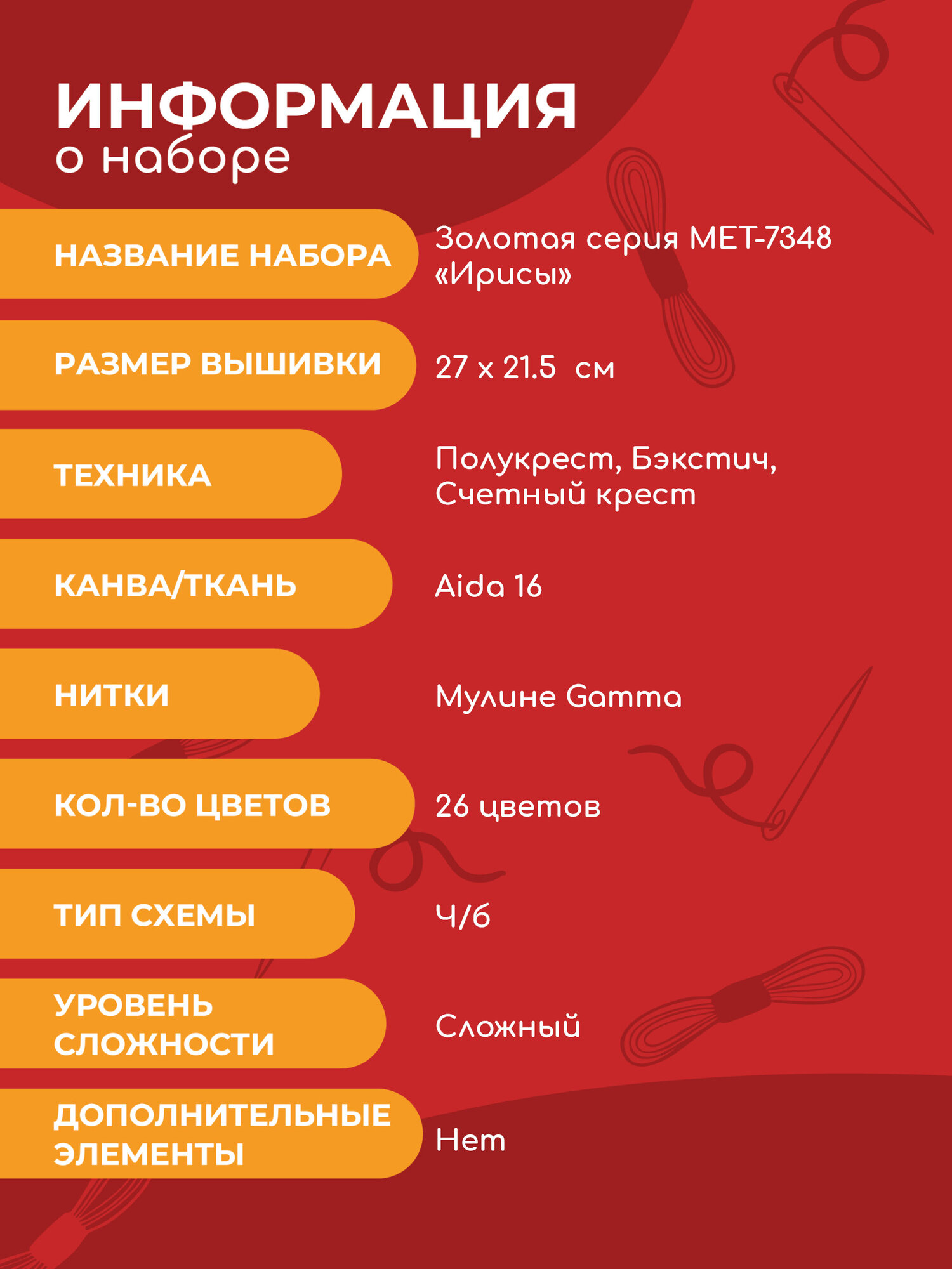 Набор для вышивания крестиком MET-7348 Золотая серия. Ирисы от производителя PANNA – это прекрасный выбор для тех, кто увлечен рукоделием и творчеством. Размер работы 31,5x43 см, готовое изделие можно оформить в рамку. В составе все необходимое для опытных и начинающих мастериц: Канва Aida No16 Gamma белая без нанесенного рисунка, хлопковые нитки мулине Gamma 26 цветов, специализированная игла с тупым концом для вышивания счетным крестом, подробная инструкция и схема ч/б. Вам понадобятся только пяльцы для вышивания. Предоставляем схему в PDF формате по запросу на почту указанную на обороте упаковки.