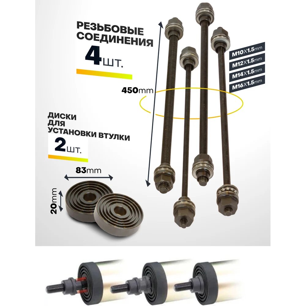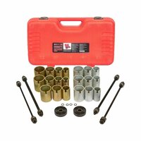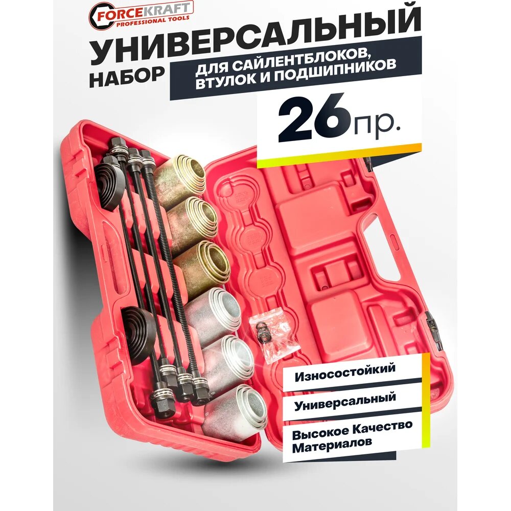 Одной из наиболее частых операций, связанных с ремонтом ходовой части автомобилей, является замена изношенных резиномеханических шарниров и подшипников. Применяя универсальный комплект съемных и монтажных приспособлений модели, автомеханик может производить необходимые работы, не снимая ремонтируемые узлы с автомобиля, и избежать рисков повреждения деталей и посадочных мест. В данный набор инструментов, позволяющий снимать и монтировать втулки, подшипники и сайлентблоки входит 26 предметов, предназначен для работ с валами и резьбовыми соединениями М10, 12, 14 и 16, а также множеством типоразмеров цилиндрических и конусовидных резиновых втулок. Особое преимущество данного комплекта заключается в универсальности. Имея его в своем распоряжении, мастеру не придется тратиться на покупку дорогого специализированного инструмента для ремонта конкретных моделей автомобилей. Для удобства применения набор инструментов для замены сайлентблоков и подшипников комплектуется прочным пластиковым кейсом. Размеры внутренних надставок : Ø 34, 36, 38, 40, 42, 44, 46, 48, 50, 52, 54, 56, 58, 60, 62, 64, 66, 68, 70, 72мм. Размеры внешних надставок : Ø 44, 46, 48, 50, 52, 54, 56, 58, 60, 62, 64, 66, 68, 70, 72, 74, 76, 78, 80, 82мм.