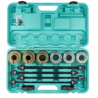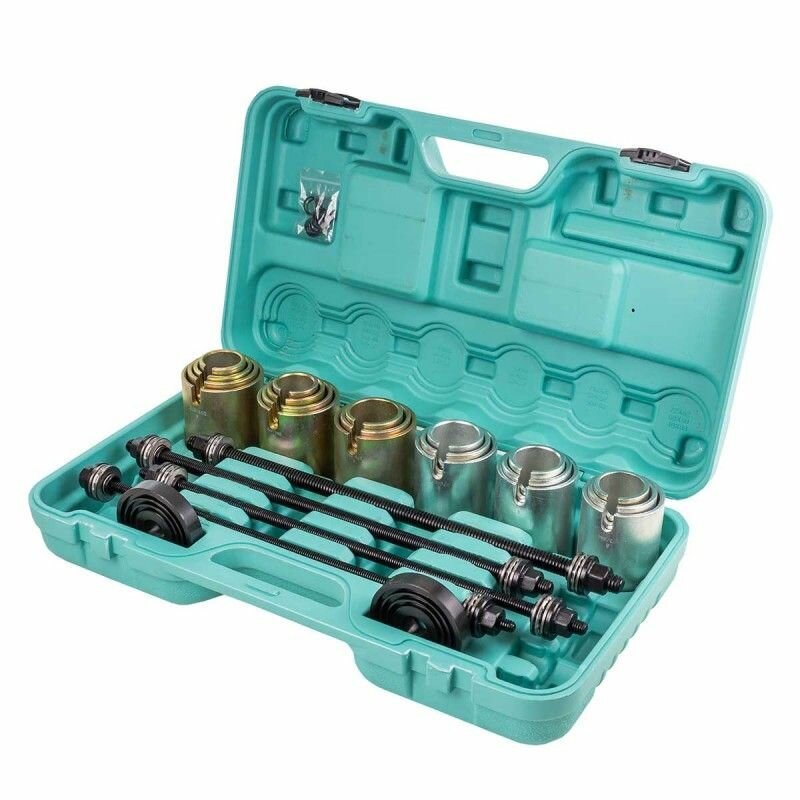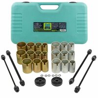 В данный набор инструментов, позволяющий снимать и монтировать втулки, подшипники и сайлентблоки входит 26 предметов, предназначен для работ с валами и резьбовыми соединениями М10, 12, 14 и 16, а также множеством типоразмеров цилиндрических и конусовидных резиновых втулок. Материал: углеродистая сталь. Толщина стенки 5 мм. Высота оправы: 94 мм. Внешний диаметр: 44, 46, 48, 50, 52, 54, 56, 58, 60, 62, 64, 66, 68, 70, 72, 74, 76, 78, 80, 82 мм. Заглушки: 83 x 20 мм. Силовая резьба: M10 x 1.5, M12 x 1.5, M14 x 1.5, M16 x 1.5 мм. Длина винтов: 450 мм. Для удобства хранения и транспортировки поставляется в прочном пластиковом кейсе.