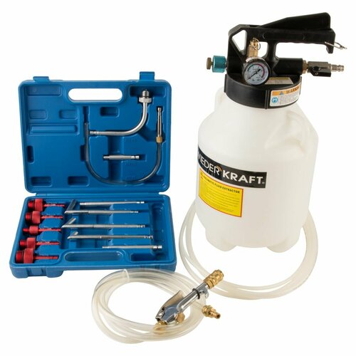 • Пневматическое устройство для замены технических жидкостей, ёмкость бака 6л. Применяется для замены масла в АКПП и прочих агрегатах, включая откачку тормозной жидкости. Поставляется с комплектом адаптеров и трубками. • Обеспечивает простое и эффективное откачивание и заправку автомобильных технических жидкостей (трансмиссионного масла, тормозной жидкости и т. д.) без приложения физических усилий. • Не создает искру, для работы достаточно одного человека. • При работе необходима подача сжатого воздуха. • Подходит для замены масла в АКПП DSG, CVT, Mercedes 722.9 и т. д. • Вакуум, создаваемый внутри бака за счёт эффекта Вентури, позволяет производить откачку технических жидкостей. Кран с торцевой части переключает режим работы на нагнетание давления в бак и осуществляет подачу жидкости за счёт вытеснения из бака. • Объем емкости: 6 л. • Размер воздушного штуцера: 1/4". • Средний расход воздуха: 56л/мин. • Температурный диапазон: от -20°C до +60°C. Технические характеристики Объем рабочей жидкости: 6 л Назначение: для прокачки Привод: ручной Класс товара: Профессиональный Вес нетто: 3.5 кг