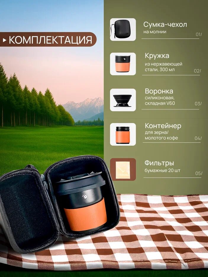 Ищете идеальное решение для приготовления свежего кофе в домашних условиях или на природе? Обратите внимание на компактный набор для заваривания кофе Joinout! Наш портативный набор включает: - кружку из нержавеющей стали объёмом 300 мл - контейнер с крышкой для зёрен/молотого кофе - силиконовую складную воронку v60 - 20 бумажных фильтров - фирменный кейс на молнии (сумка-чехол) и с ремешком для подвешивания.