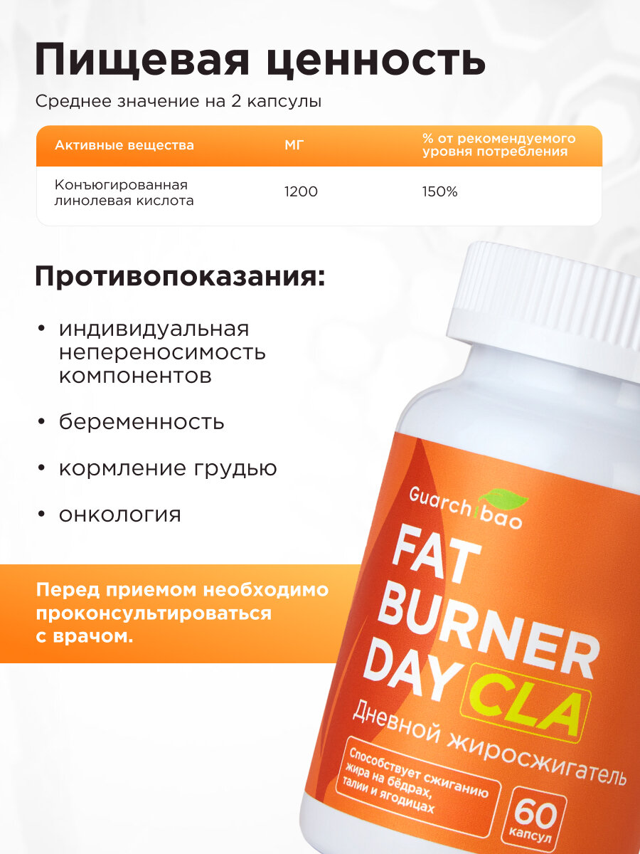 Наши таблетки для похудения эффективные женские Fat Burner Guarchibao CLA являются одними из самых эффективных среди всех доступных на рынке. Они помогут вам достичь желаемых результатов без лишних усилий и спорта. Наш жиросжигатель особенно эффективен для женщин, которые хотят избавиться от жирового отложения на животе, а также для мужчин, которые стремятся снизить вес и получить более подтянутую фигуру.