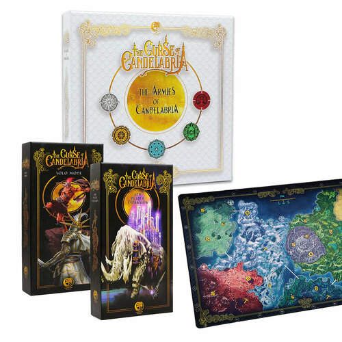 - Двусторонний неопреновый коврик с игровым полем игры «Проклятие Канделябрии». Игровое поле представляет собой земли Канделябрии. На нем появятся свечи, огни и замки, которые будут сражаться во время игры. Коврик станет незаменимым аксессуаром для всех, кто хочет максимально насладиться игрой. Размер коврика: 52х78 см.