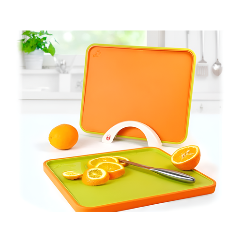 Набор из 2-х ярких разделочных досок с разделением по видам продуктов на подставке. Одна доска предназначена для разделки мясных продуктов, вторая для овощей. Благодаря имеющимся значкам легко избежать смешения запахов. Доски имеют небольшие углубления в одну из сторон для сбора сока от продуктов. Хранить на подставке их можно как в вертикальном, так и в горизонтальном положении. Доски изготовлены из высококачественного экологически чистого пищевого пластика. Можно мыть в посудомоечной машине.