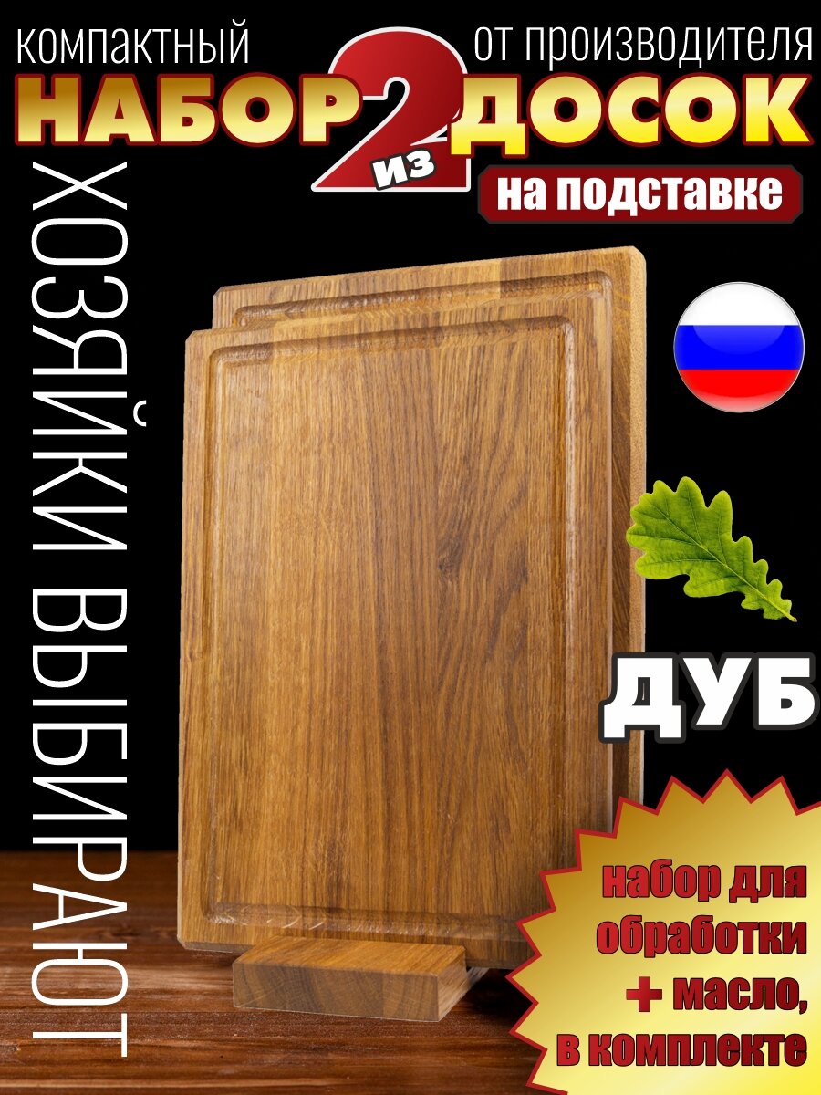 Комплект разделочных досок из дерева состоит из двух дощечек прямоугольной формы 290х210 мм и 275х190 мм при толщине 20 мм и деревянной подставки, которая имеет силиконовые ножки против скольжения. Аксессуары комплекта ничем не покрыты. В комплектацию входит набор для покрытия досточек защитным минеральным маслом для кухонных принадлежностей. Вы можете обработать их самостоятельно, в наборе есть инструкция и все необходимое для этого. Покрытие маслом увеличивает износостойкость и долговечность деревянной утвари. Подарочный набор российского производства изготовлен из массива дубового щита, полностью экологичен, дерево идеально обработано, без сучков и зазубрин. Досочки идеальны в процессе готовки и подойдут для нарезки и разделки любых продуктов. Каждую из досок можно использовать в качестве сервировочной посуды, сырной доски для вина, сервировки закусок, канапе, суши и роллов, мяса сыра шашлыка фруктов или овощей. Новинка экопосуда для стейка или для подачи пиццы. Доски без покрытия применяются в творчестве для декупажа, рисования, росписи, в качестве заготовки для декорирования или выжигания. Включи свою фантазию и простой инвентарь превратится в стильный красивый декор для дома дачи кухни или столовой, для пикника на природе. Многофункциональная кухонная утварь будет оригинальным и недорогим подарком любимой жене женщине мужчине подруге маме и папе бабушке и дедушке тете и дяде, родителям девушке и сестре на свадьбу годовщину новоселье восьмое 8 марта день рождения.