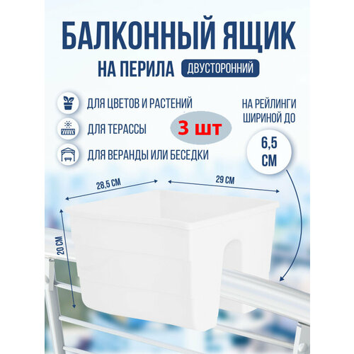 Размеры каждого ящика: длина — 29,5 см, ширина — 28,5 см, высота — 20 см. Компактные габариты позволяют разместить растения даже на ограниченном пространстве, а двусторонняя конструкция помогает максимально эффективно использовать площадь перил — цветы будут радовать глаз с обеих сторон.