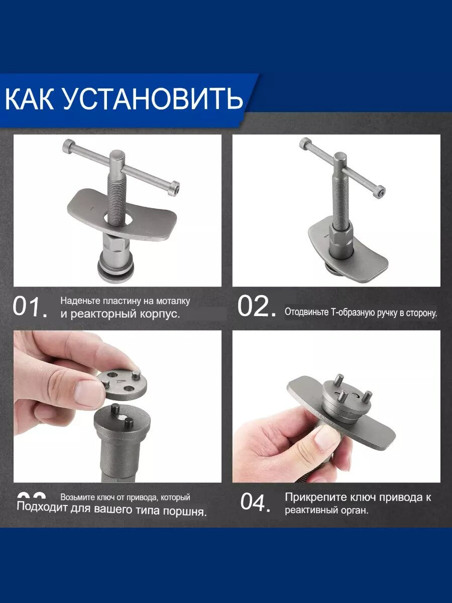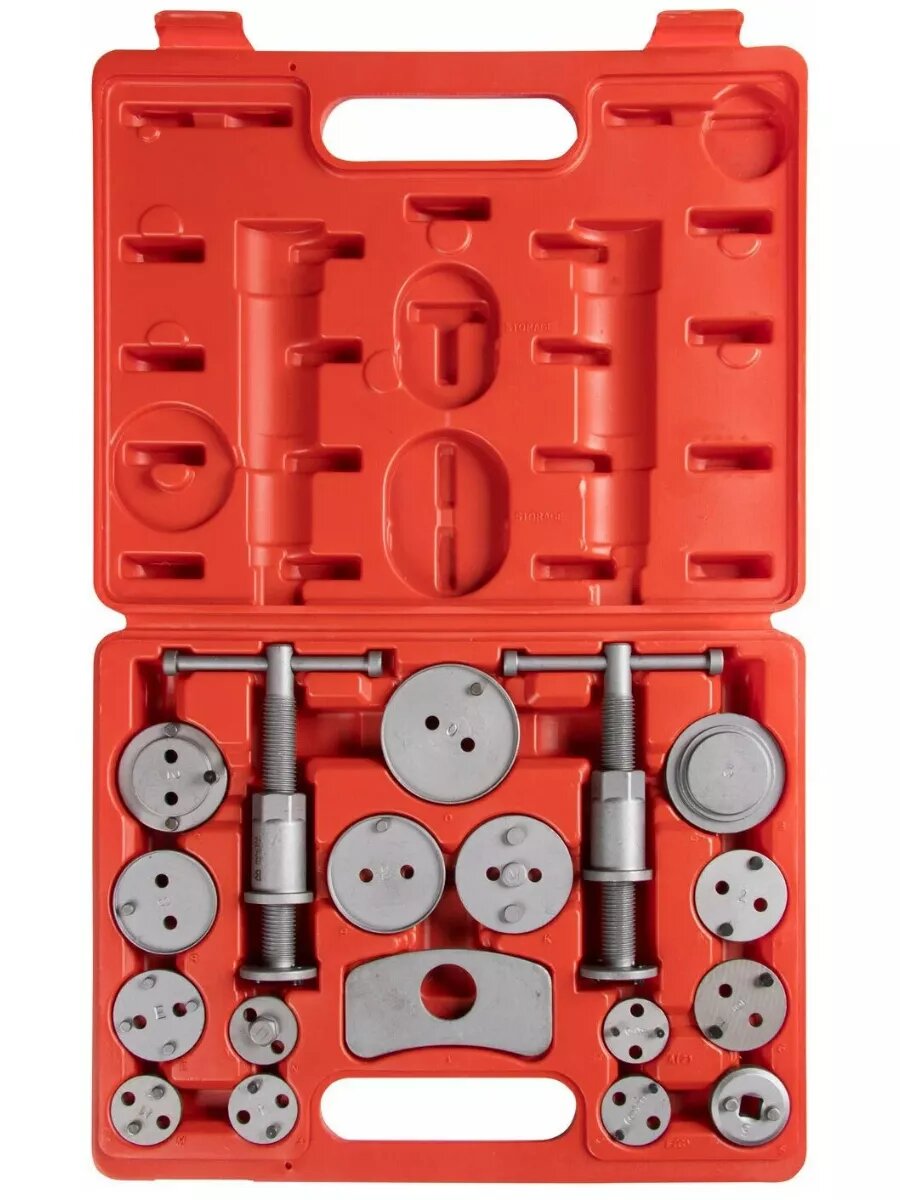 Насадка-адаптер под вороток, для совмещения пазов на поршне и в тормозных накладках - 1шт Насадка для утапливания поршней без вращения - 1шт Т-Образная рукоятка с правой и левой резьбой - по 1 шт. Планка упор - 2шт Насадки для утапливания - 15шт разного диаметра.