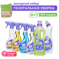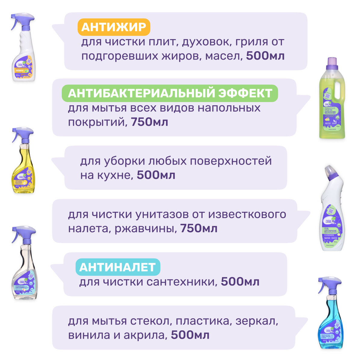 Средство для мытья стекол, пластика и зеркал с антистатическим эффектом - 500мл, чистящее экологичное средство для сантехники без хлора на основе фруктовых кислот - 500мл, чистящее биоразлагаемое средство для удаления стойких пригоревших загрязнений Антижир - 500 мл, универсальный чистящий ЭКО-спрей для кухни гипоаллергенный с экстрактом лимона - 500мл, антибактериальное ЭКО-средство для мытья пола без хлора, фосфатов, с эфирными маслами грейпфрута и бергамота - 750 мл, чистящий ЭКО-Гель для унитазов без хлора и фосфатов на основе лимонной кислоты - 750мл, универсальное моющее ЭКО-средство с дезинфицирующим эффектом,без хлора и фосфонатов, 300 г. Средство для мытья стекол, пластика и зеркал 500 мл., Средство для сантехники 500 мл., Средство для удаления жира Антижир 500 мл., Универсальный спрей для кухонных поверхностей 500 мл., Универсальное средство для мытья пола 750 мл., Гель для унитазов 750 мл., Средство универсальное с дезинфицирующим эффектом 300 г