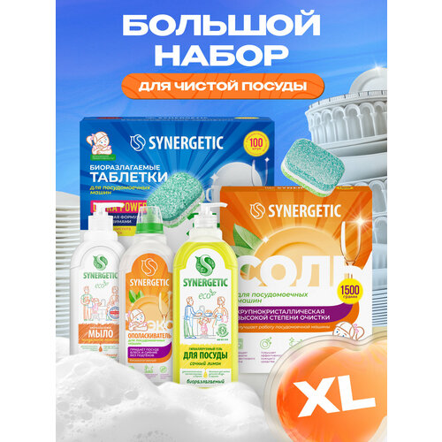 Набор для посудомоечных машин Синергетик тщательно подобран для кристально чистой посуды и комфорта хозяйки. Включает максимум эффективных средств для мытья посуды.