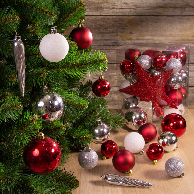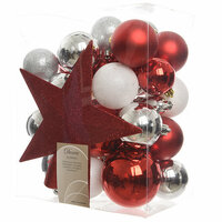 Купить Набор елочных шаров с верхушкой Классический Дуэт 33 предмета, красный с серебром, Kaemingk, 023324 с доставкой по всей России.