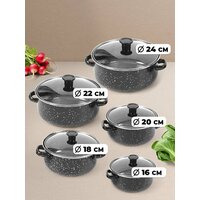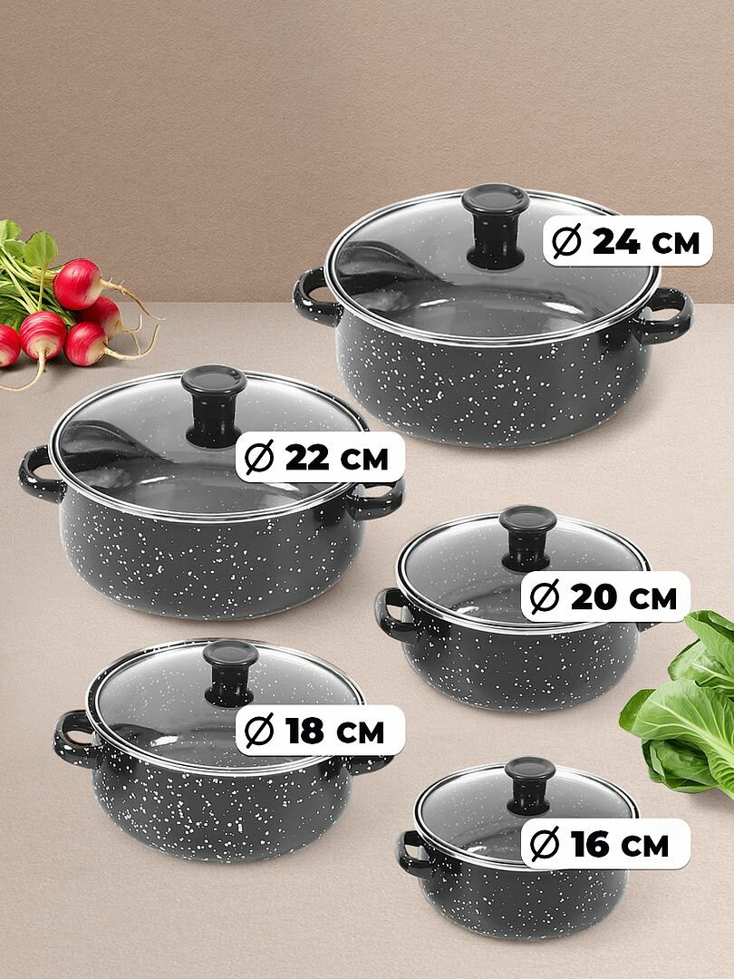 Набор кастрюль с крышками для приготовления 5 штук - это незаменимая эмалированная посуда для дома на вашей кухне. С набором кастрюль из нержавейки для приготовления (5 штук), вы сможете готовить самые изысканные блюда и организовать свою кухню наилучшим образом. Этот набор идеально подходит для приготовления различных блюд, будь то супы, соусы, каши или паста. Особенности набора кастрюль: - Корпус из холоднокатаной стали: кастрюли изготовлены из качественной холоднокатаной стали толщиной 0,6 мм, обладающей прочностью и долговечностью. Это гарантирует долгое использование и превосходные результаты при приготовлении. - Эмалированное покрытие: каждая кастрюля покрыта эмалью, которая обеспечивает дополнительную защиту от коррозии, а также облегчает уход за посудой. Поверхность эмалированной кастрюли гладкая, благодаря чему она легко моется и не поглощает запахи и вкусы. - Крышки из стекла: в наборе включены крышки из стекла, которые позволяют наблюдать за процессом приготовления, не открывая крышку. Окантовка из нержавеющей стали на крышках обеспечивает прочность и долговечность. - Разнообразные размеры: набор кастрюль включает пять разных размеров: 16/18/20/22/24 см. Это позволяет выбирать подходящую кастрюлю в зависимости от количества приготавливаемой пищи. - Вместительность: кастрюли имеют различные объемы: 1 л, 1.5 л, 2 л, 3 л и 4 л. Благодаря этому вы сможете готовить как небольшие порции, так и большие семейные ужины. - Удобная ручка: каждая кастрюля оборудована удобной ручкой, которая обеспечивает надежный захват и комфорт при использовании. Преимущества набора кастрюль для приготовления: - Универсальность использования: этот набор идеален для приготовления различных блюд, от супов до соусов и стейков. Он обеспечивает равномерное распределение тепла, что позволяет сохранить все полезные вещества в продуктах. - Прочность и долговечность: корпус из холоднокатаной стали и эмалированное покрытие обеспечивает долгий срок службы и эксплуатации!