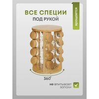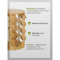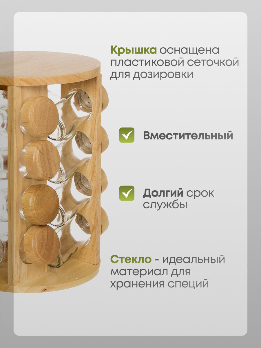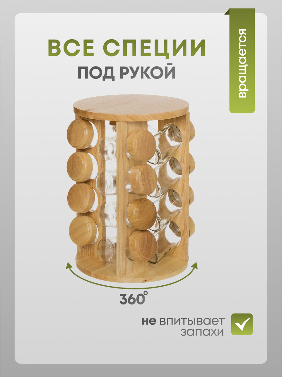 Этот набор для специй станет отличным дополнительным украшением для вашей кухни. Комплект включает 16 стильных баночек размером 3.8х3.8х10 см, предназначенные для хранения приправ и специй, а также красивая и функциональная деревянная подставка диаметром 20 см. Стеклянные изделия с крышками из дерева выглядят эстетично и органично вписываются в любой интерьер.