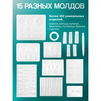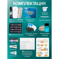 Набор молдов и аксессуаров: Глиттер (цветные паетки) 48 бутылочек; Фурнитура для создания украшений; Металлические кольца, зажимы; Подарочная коробка; УФ-лампа; Многоразовый мягкий молд для заливки; Пластиковые мерные стаканчики; Декоративные элементы; Основы (крепление) для сережек, брелков, подвесок; Средства защиты: салфетка, маска, перчатки, скатерть, фартук
