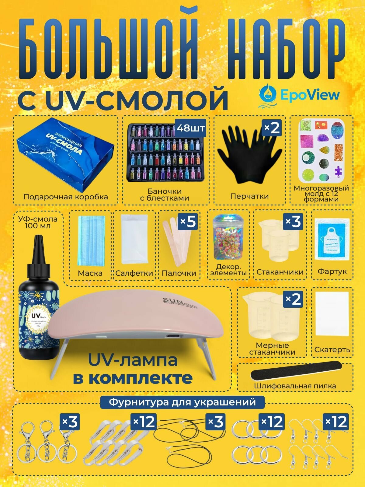 Набор молдов и аксессуаров: Глиттер (цветные паетки) 48 бутылочек; Фурнитура для создания украшений; Металлические кольца, зажимы; Подарочная коробка; УФ-лампа; Многоразовый мягкий молд для заливки; Пластиковые мерные стаканчики; Декоративные элементы; Основы (крепление) для сережек, брелков, подвесок; Средства защиты: салфетка, маска, перчатки, скатерть, фартук