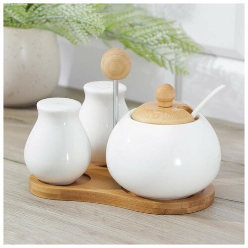 Купить Набор фарфоровый для специй Доляна «Эстет», 3 предмета: солонка 80 мл, перечница 80 мл, сахарница с ложкой 300 мл, цвет белый с доставкой по всей России. Набор фарфоровый для специй Доляна «Эстет», 3 предмета: солонка 80 мл, перечница 80 мл, сахарница с ложкой 300 мл, цвет белый: сравнение цен, характеристики, фото, актуальное наличие и цены.