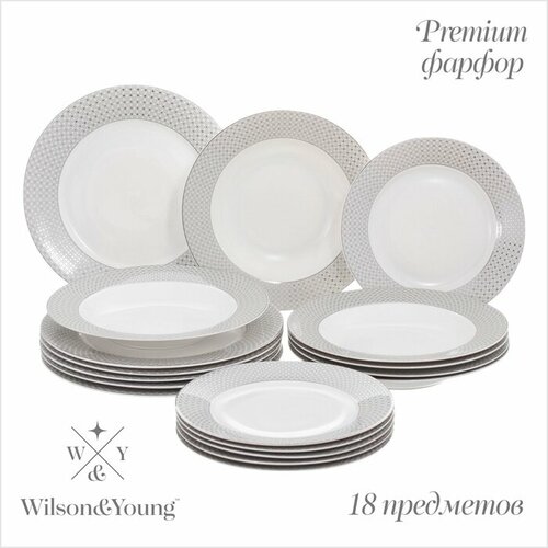 Набор посуды WY "Eternal" - это столовый сервиз, состоящий из 18 предметов. В него входят 6 круглых десертных тарелок диаметром 25,5 см, 6 обеденных тарелок диаметром 20,5 см и 6 суповых тарелок диаметром 23 см.