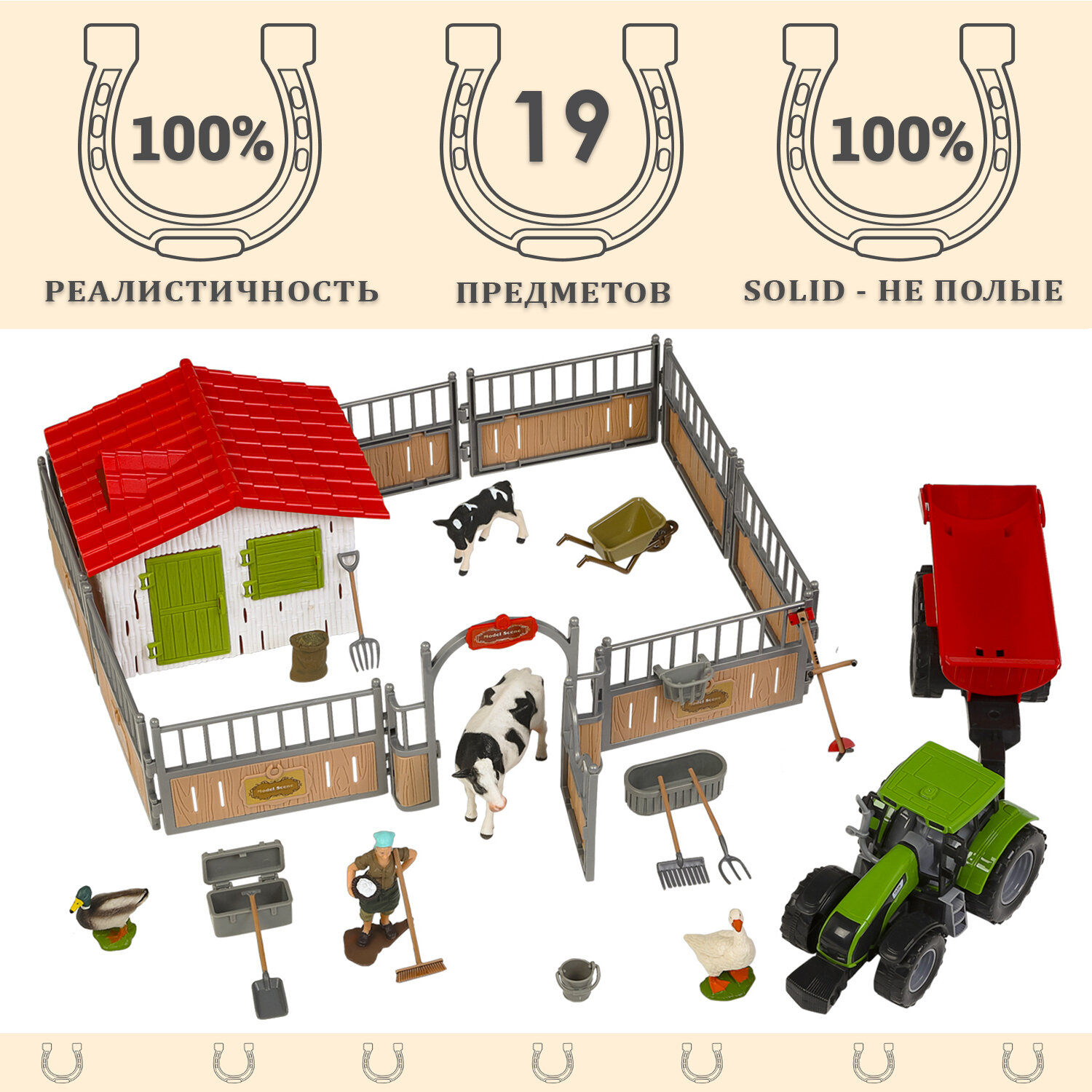 | Комплектация | домик (28х9х28), загон (15х10х15), овца (10х7х3,5), курица (5х5,5х2,5), мешок (3х3,5х2), сено (4х3х2), ящик (4х3,5х3,5), щетка (5х3х0,5), лопата (5х1,5х0,5), грабли (5х3х0,5), вилы 2 шт (5х1,5х0,5; 5х1,5х0,5), газонокосилка (6х3х3), тележка (7х3,5х3,5) |