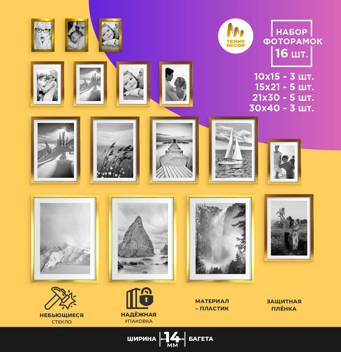 Набор фоторамок 16шт золото на стену (гарантия целости!), рамки для фотографий, фоторамки для фотографий, комплект коллаж настенные, рамки небьющиеся (10 х 15 см, 15 х 21 см, 21 х 30 см, 30 x 40 см), золотая, TENKO DECOR, 16 шт.: сравнение цен, характеристики, фото, актуальное наличие и цены.