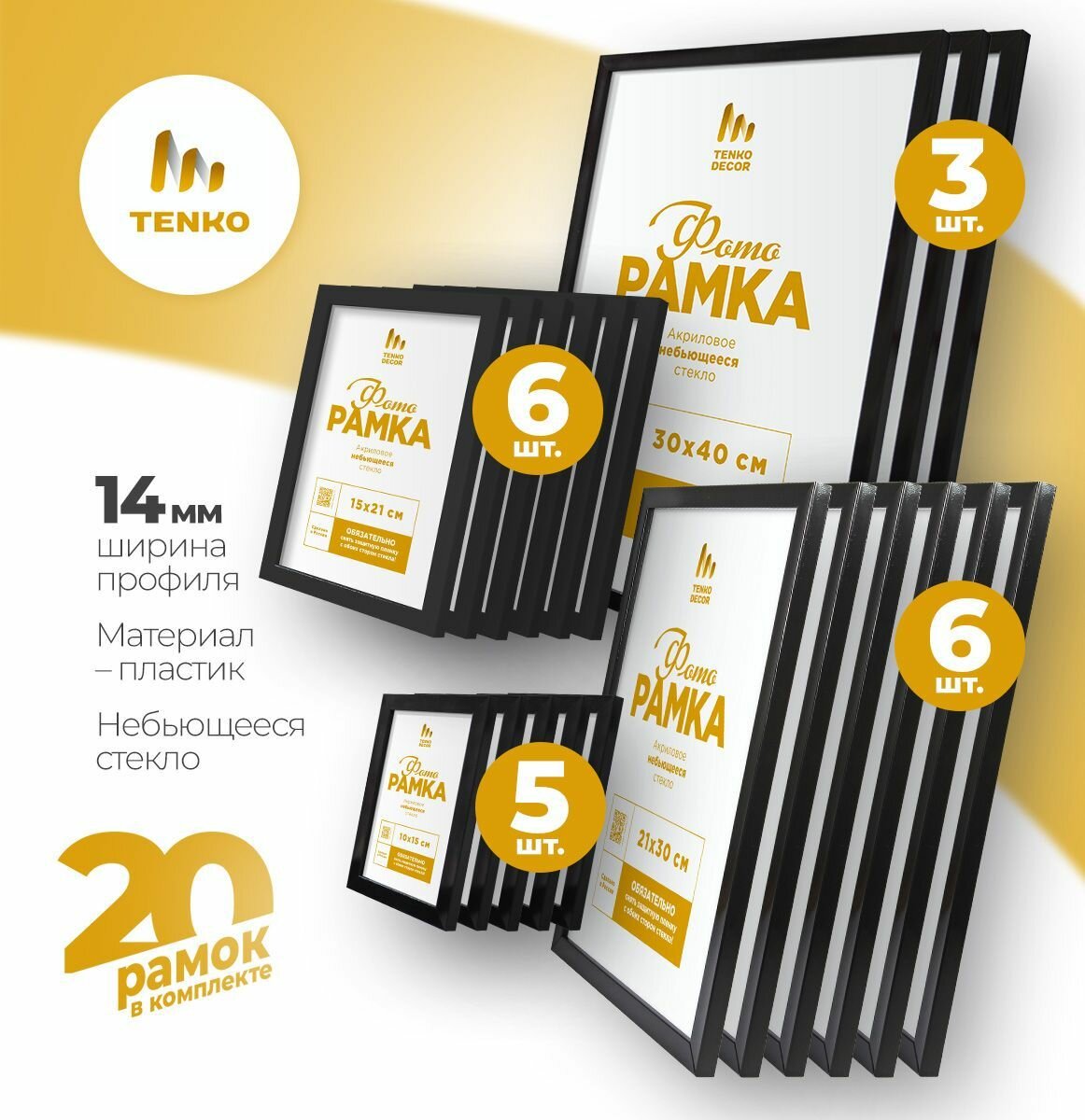 Купить Набор фоторамок 20шт черный на стену (гарантия целости!) рамки для фотографий, фоторамки для фотографий, комплект фоторамок, коллаж из фоторамок, фоторамки настенные, рамки небьющиеся (21х30, 15х21, 10х15, 30х40), Tenko Decor, 20 шт. с доставкой по всей России.