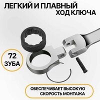 Трещоточный механизм с шарниром в накидной части ключа, позволяет комфортно работать в местах с ограниченным пространством.