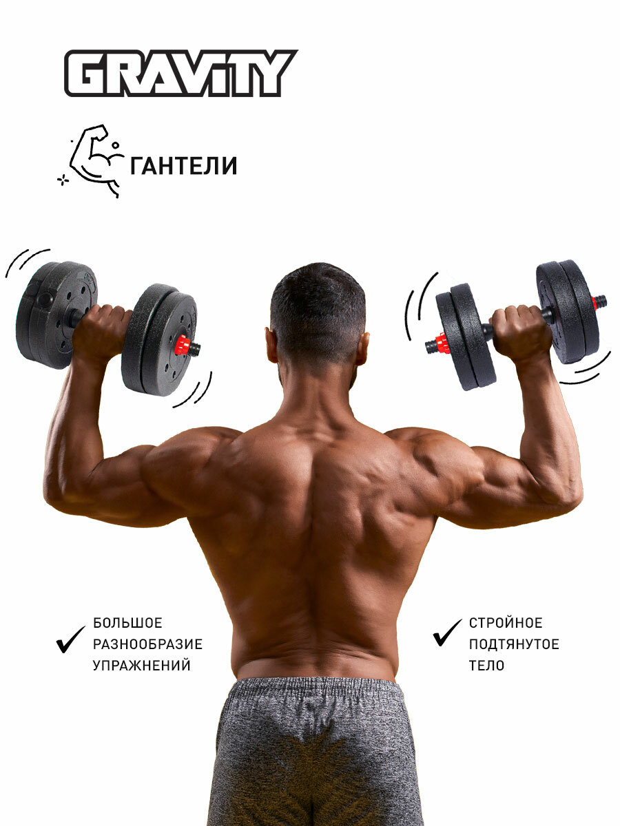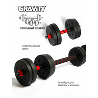 Набор гантелей разборных с грифом для штанги Gravity (TBRBL)Набор гантелей-трансформеров с грифом для штанги от бренда Gravity – незаменимый инструмент для разнообразных силовых упражнений и поддержания отличной физической формы. Он обеспечивает комфорт и надежность для тренировок в любом месте, позволяя эффективно развивать и укреплять мышцы всего тела. Все элементы данного набора изготовлены из высококачественных материалов, гарантирующих уникальную прочность и долговечность снарядов. Разнообразие весов, предоставляемых в комплекте, и два варианта конфигурации (гантели или штанга) дарят пользователям широкий спектр нагрузок, которые легко подстраиваются под индивидуальные потребности. Удобные размеры гантелей и грифа делают этот набор подходящим для использования людьми любой комплекции. • Многофункциональность: Комплект включает в себя гриф, позволяющий превратить гантели в полноценную штангу. Это расширяет спектр упражнений, которые вы можете выполнять с помощью этого набора, и делает ваши домашние тренировки разнообразнее и эффективнее.• Регулируемый вес: Набор включает в себя диски с различными вариантами веса, что делает его идеальным инструментом для тренировок всех членов семьи. Вы можете быстро настроить нагрузку в соответствии с вашими тренировочными потребностями. Это отличное решение как для начинающих, так и для опытных спортсменов.• Материалы высокого качества: Диски гантелей изготовлены из прочного ПВХ с цементным наполнителем, обеспечивая надежность снаряда и долгий срок службы. Удобные рукоятки с насечкой и гриф с мягким покрытием дарят дополнительный комфорт во время тренировок.