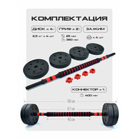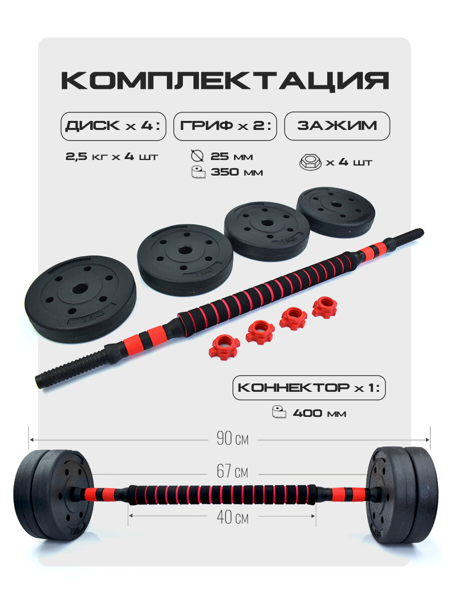 Набор гантелей разборных для фитнеса идеален как для домашних занятий и силовых тренировок, так и для спортзала. Гантели трансформер – тот спортивный инвентарь для фитнеса и тяжелой атлетики, с которым вы непременно добьетесь красивой подкаченной фигуры. Гриф выполнен из ударопрочного пластика и имеет обрезиненные вставки с насечками, которые обеспечивают плотное прилегание гантели к руке без скольжения. Для надежной и быстрой фиксации дисков в комплекте имеются прочные пластиковые зажимы на гриф. Диски для гантелей изготовлены из прочного ПВХ, наполнитель - композитная смесь цемента и песка. В отличие от металлической гантели, пластиковая гантель не гремит и не повреждает покрытие пола. Гантели пластиковые - идеальный спортивный снаряд для укрепления мышц рук, груди и спины. Более того, с помощью специального коннектора, эти наборные гантели легко превращаются в разборную штангу. Для комфортного использования коннектор имеет мягкое нескользящее неопреновое покрытие. В набор сборных гантелей входят: диски виниловые 2,5 кг х 4 шт, гриф пластиковый х 2 шт. (посадочный диаметр 25 мм, длина 35 см), замок-гайка х 4 шт, коннектор для штанги х 1 шт (длина 40 см). Общий вес гантельного набора - 10 кг. Сборные гантели удобны тем, что вы можете с легкостью менять вес гантелей на нужный. Вы можете собрать одну гантель для фитнеса 10 кг или две по 5 кг. Набор гантелей ProRun - отличный подарок себе или вашим друзьям, любителям фитнеса и тяжелой атлетики. Обратите внимание, что фактический вес гантелей может отличаться в пределах 5%.