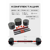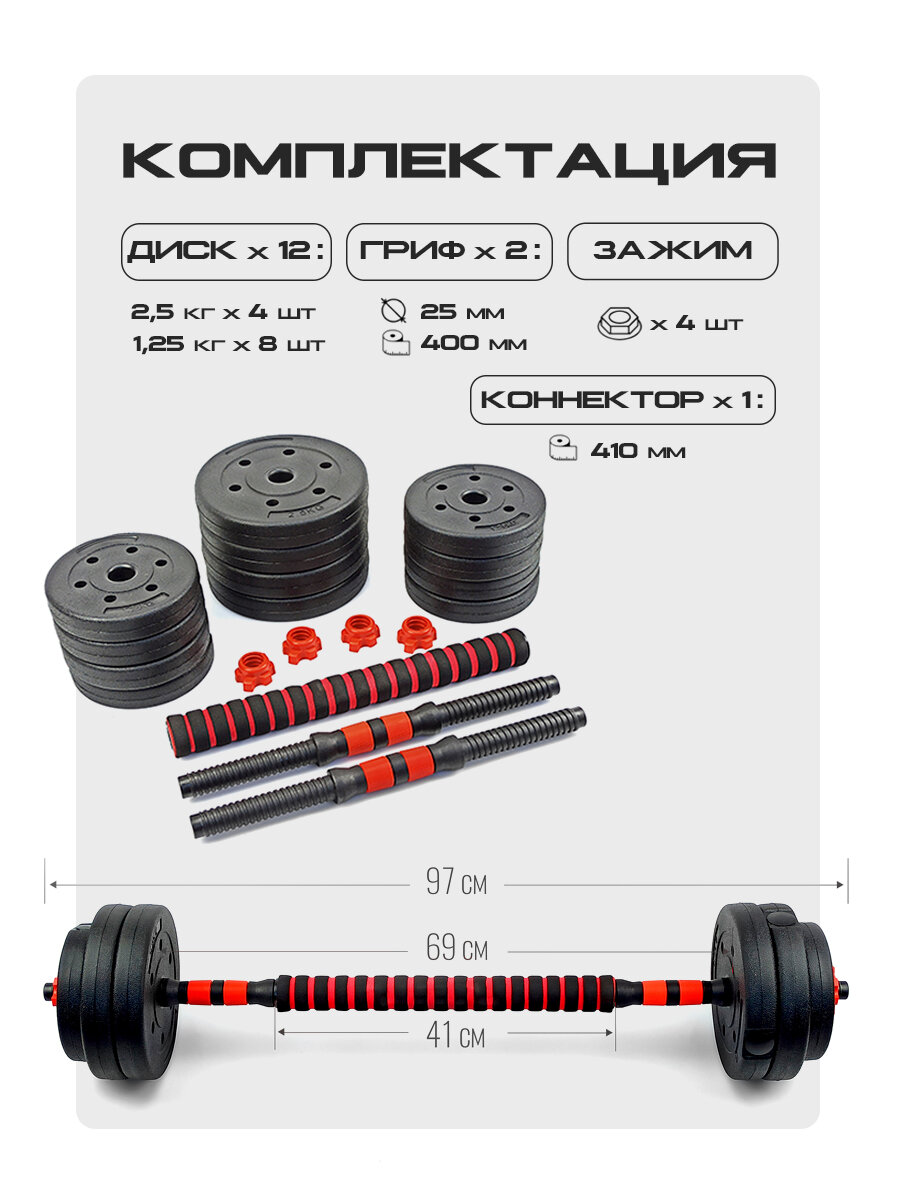 Нет возможности ходить в спортзал, но не хотите забрасывать тренировки? Занимайтесь силовыми упражнениями в домашних условиях вместе с нашим набором разборных виниловых гантелей ProRun! Разборные гантели до 20 кг идеально подходят для домашних тренировок и служат для укрепления мышц рук, груди и плеч. Внешняя оболочка гантели для фитнеса сделана из прочного ПВХ, наполнитель - композитная смесь цемента и песка. Насечки на рукоятке грифа обеспечивают плотное прилегание гантели для фитнеса к руке без скольжения, а фигурные гайки - надежную фиксацию дисков. Гантель разборная, что позволяет менять вес по своему усмотрению. В отличие от металлических гантелей, пластиковые гантели не гремят и не повреждают покрытие пола. В комплект входят: гриф гантельный 2 шт, диски для штанги 12 шт, крепления 4 шт. В комплектацию набора 20 кг, также входит коннектор для штанги. Более подробную комплектацию смотрите на инфографике или в характеристиках к соответствующему комплекту гантелей. Гантельный набор - идеальный подарок для друзей-спортсменов или для себя.