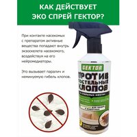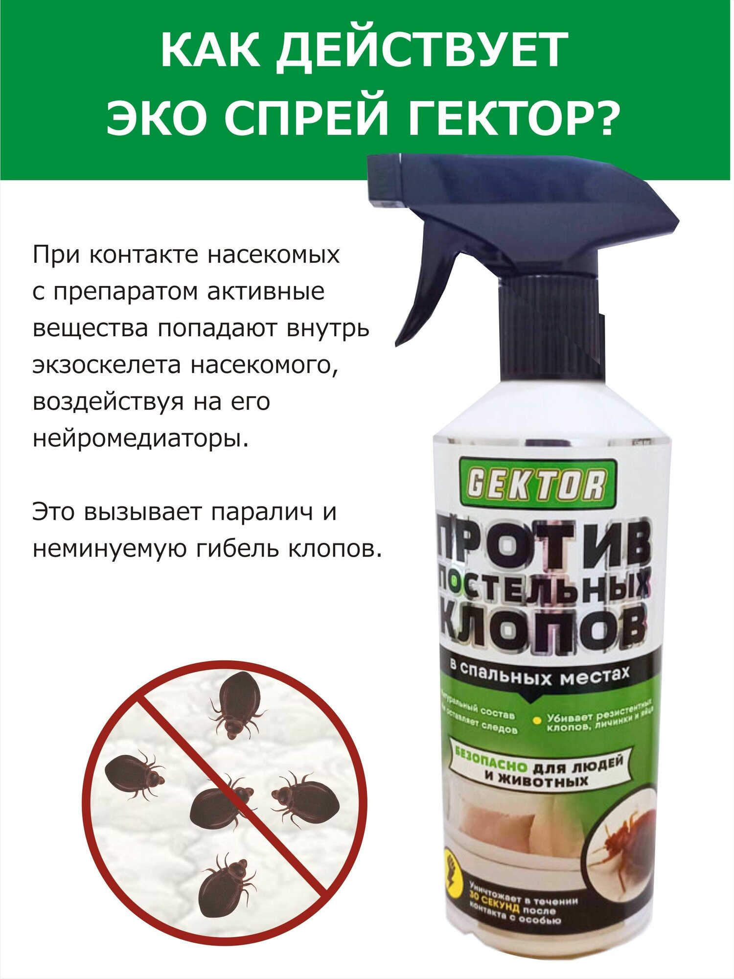 ЭКО спрей гектор жидкий не оставляет следов на мебели и тканях. При контакте с препаратом активные вещества спрея попадают внутрь экзоскелета насекомого, воздействуя на его нейромедиаторы. Это вызывает паралич и неминуемую гибель клопов. Он нужен для обработки поверхностей, на которых не может находиться порошок. Важно, чтобы спрей не попал на порошок, так как порошок работает только пока остаётся сухим!
