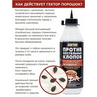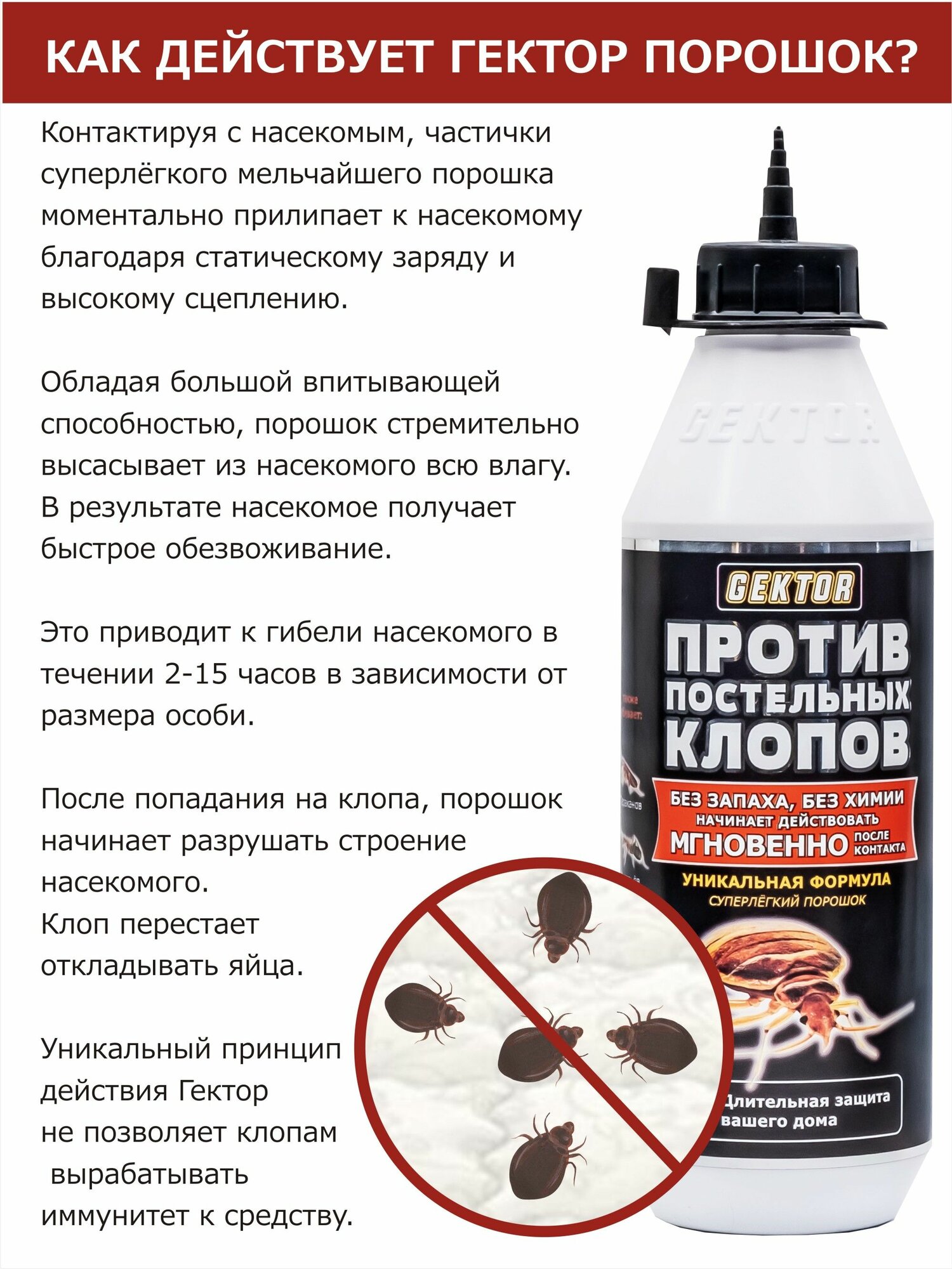 После попадания порошка на клопа, он перестает откладывать яйца, так как порошок для клопов начинает разрушать строение насекомого. Насекомые погибают в течении 2-х часов после контакта. Гектор от клопов постельных не позволяет насекомым вырабатывать иммунитет к средству. Средство от клапов порошок имеет длительный срок защиты, оно продолжает работать в течение 3-4 недель пока остается сухим.