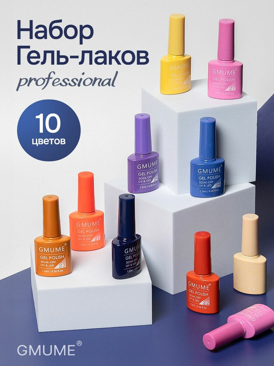 Набор профессиональных гель-лаков 10 цветов по 7.5 мл. Гель-лаки имеют плотную кремовую консистенцию с высоким пигментом, просты в работе, отлично подойдут для рисования. Верхний слой - липкий, что усиливает сцепку со следующим покрытием, топом и позволяет нанести элементы декора без дополнительного нанесения средства с липким слоем. Гели отлично самовыравниваются и не затекают на кутикулу. Не скатываются, не отслаиваются, не полосят - специальная формула средства позволяет лаку сливаться с предыдущим слоем, не меняя заявленного оттенка. Полимеризация в профессиональной UV и LED лампе 30-90 сек. (зависит от толщины нанесенного слоя). Вы можете создать свой уникальный и неповторимый дизайн. Наборы гель лаков отлично подойдут на подарок для подруги, девушки, мамы, для себя, сестры, коллеге на Новый год, День Рождения, 8 марта, день святого Валенетина и любой другой праздник.
