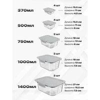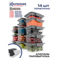 В набор входит 14 контейнеров разных объемов. Комплектация: контейнер 370 мл - 4 шт; контейнер 500 мл - 4 шт; контейнер 750 мл - 2 шт; контейнер 1000 мл - 2 шт; контейнер 1400 мл - 2 шт.