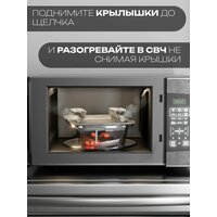 Специальная форма крышки и клапаны по бокам контейнера позволяют класть емкость в микроволновую печь с закрытой крышкой, но надо приподнять защелки до щелчка.