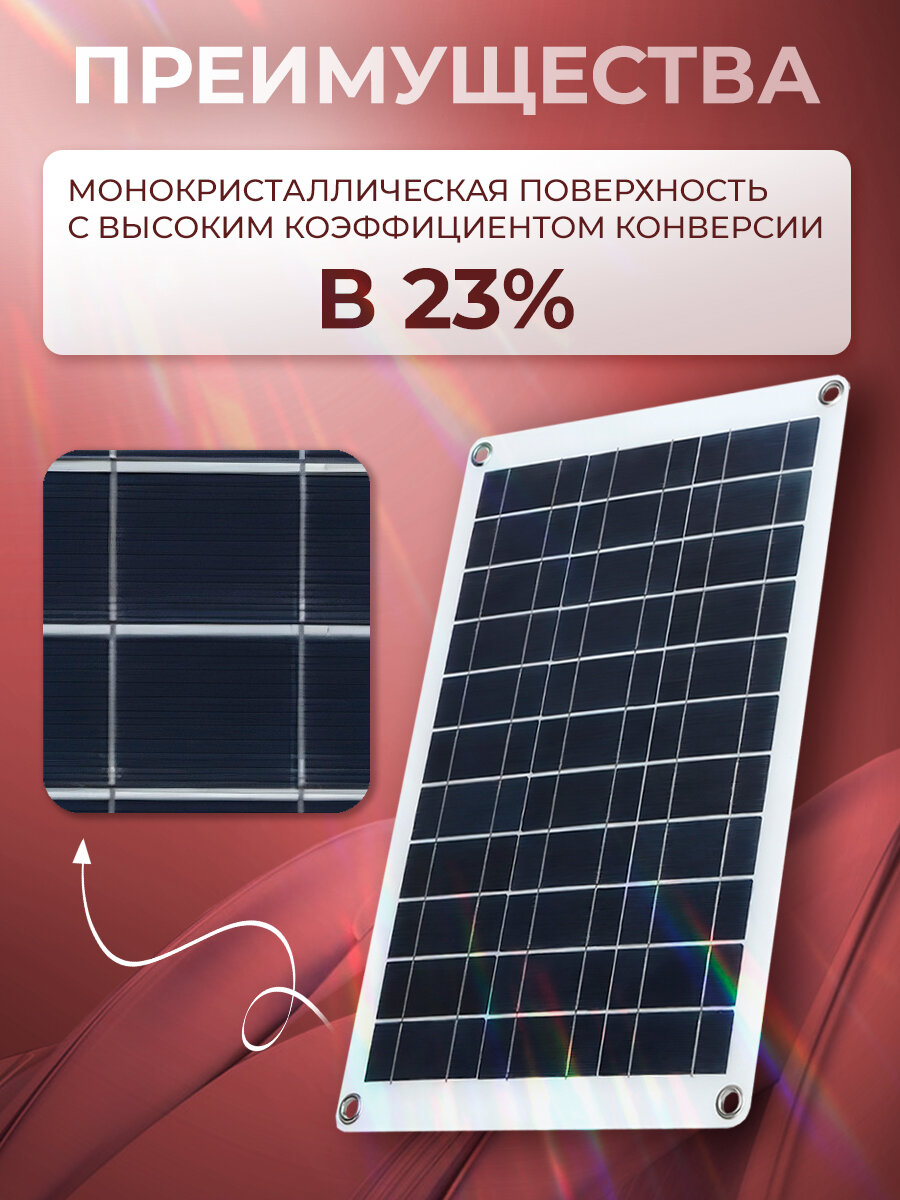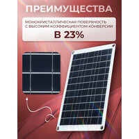 Набор гибких солнечных батарей 60Вт Sol Energy 5В/18В (2шт) предназначен для эффективного использования солнечной энергии. Каждая солнечная панель в наборе разработана с использованием передовых технологий, позволяющих достичь максимальной эффективности при преобразовании солнечного излучения в электрическую энергию. Благодаря высокому КПД и надежным материалам туристическая портативная солнечная электростанция способна обеспечить стабильное и непрерывное питание даже в условиях низких освещенности или пасмурной погоды. Кроме того, гибкость солнечных батарей для туризма и для дома позволяет установить их на практически любой поверхности, включая крышу автомобиля, надувные лодки и палатки, что делает их идеальным решением для поездок на открытом воздухе или кемпинга. Набор на солнечных батареях легко складывается и не занимает много места, что позволяет удобно транспортировать его в любом путешествии. Использовать комплект можно и для зарядки телефона как павербанк. Аккумулятор для дачи обладают широким диапазоном входного напряжения: от 5 до 18 В, что обеспечивает их совместимость с различными типами источников энергии. Периодически проверяйте состояние солнечных батарей. Убедитесь, что они не повреждены и работают без сбоев. Очищайте поверхности батарей от грязи и пыли для обеспечения наилучшей эффективности. Походная батарея заряжается под прямыми солнечными лучами. Для этого разместите ее на открытом пространстве, без препятствий. Солнечный модуль для гаджетов необходимо использовать в соответствии с инструкциями по безопасности. Не пытайтесь самостоятельно разбирать или модифицировать батареи. Характеристики: Материал: ПЭТ Панель: монокристаллическая с высоким коэффициентом конверсии 23% Количество панелей: 2 шт Общая мощность: 60 Вт (одна панель - 30вт) Напряжение без нагрузки: 20 В постоянного тока Напряжение нагрузки: 12 В постоянного тока Выход 1: постоянный ток, 18 В Выходной ток: 3100 мА (макс.) Уровень защиты: IP65 Размер панели: 420*270*25 мм Длина кабеля зажима: 700 мм Длина кабеля зарядки от прикуривателя: 650 мм Комплектация: 2 * панель 2 * зажим типа крокодил постоянного тока 2 * зарядка от прикуривателя
