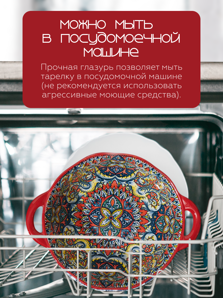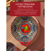 Восточная сказка на Вашем столе! Взрыв красок, симфония форм, танец узоров – все это объединилось невероятно выразительной керамической тарелке Homium Kitchen Multi серии Мехроб. Тарелка с традиционным узбекским орнаментом стилизована под национальный ляган для подачи восточного плова, бешбармака и других блюд. Посуда станет идеальным фоном для блюда, подчеркнув его насыщенный вкус и аромат.