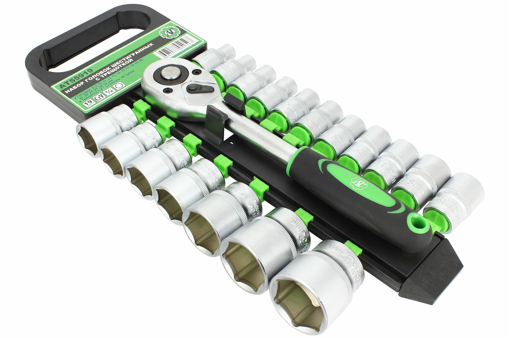 Купить Набор головок AT, 19 предметов, хромованадиевая сталь, 6-гранные, 1/2″, с трещоткой с доставкой по всей России.